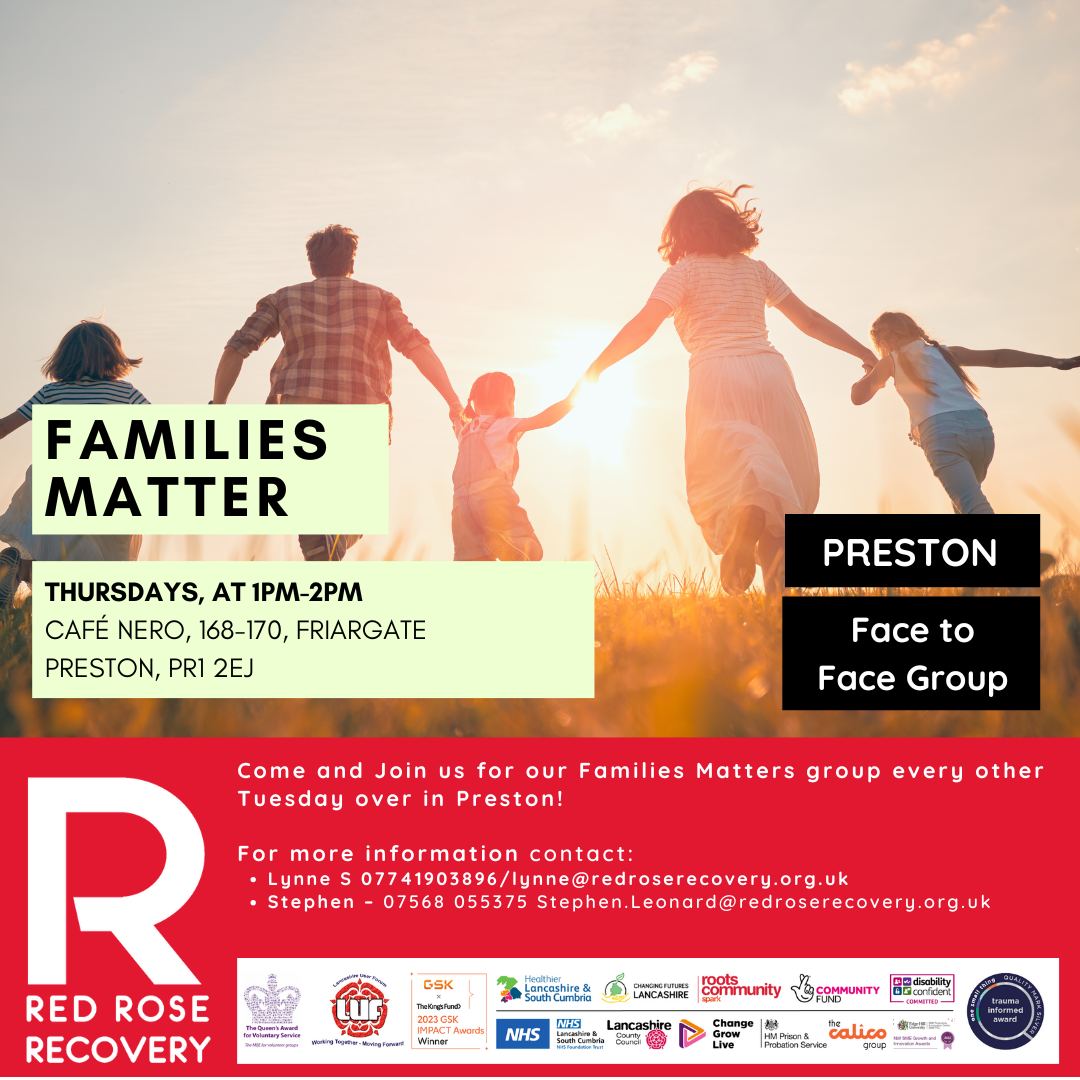 Date Thu 29 Jan 2026 Time 1:00 am - 2:00 pm Families Matter – Preston Share this on social media: Come and Join us for our Families Matters group every other Thursday over in Preston! For more information contact: Lynne S 07741903896/lynne@redroserecovery.org.uk Stephen – 07568 055375 Stephen.Leonard@redroserecovery.org.uk Related News:Tea, Toast and Chat - PrestonCentral Lancashire User Forum - PrestonFive Ways to Wellbeing - PrestonRisk of Relapse - PrestonLIFE Programme - PrestonInternational Women's Day - Preston Share this event + Add to Google Calendar + iCal / Outlook export 00 days 00 hours 00 minutes 00 seconds